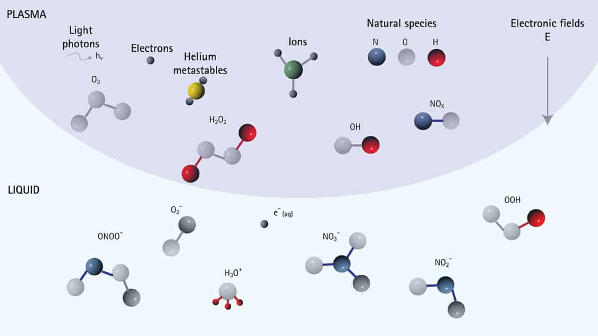 This plasma process changes the chemical composition of the water and creates reactive oxygen and nitrogen species (RONS) in the water, some of which dissolve in the water and also react with the water to form other species. However, there is no concrete specification of PAW, as the composition of the RONS is highly dependent on the respective treatment parameters.