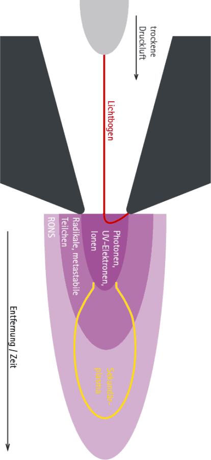 Plasma ist per Definition ein angeregtes Gas und enthält daher eine Mischung aus kurzlebigen Spezies wie Elektronen, Ionen, Radikale und neutrale Teilchen. Die geladenen Spezies sind problematisch, wenn ESD-empfindliche Bauteile einer Plasmabehandlung ausgesetzt waren. Da vor allem die geladenen Spezies eine kurze Lebensdauer haben und zu Radikalen und letztlich zu reaktiven Oxid- und Stickstoffspezies (RONS) rekombinieren, verliert der Abstrom des Plasmas mit der Zeit seine Ladung und damit an Entfernung.